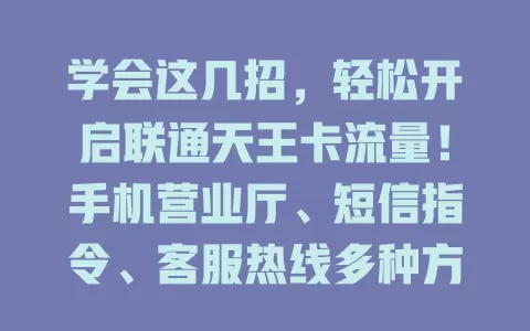 联通天王卡用户看过来!流量不够用的时候,怎么开启联通天王卡流量呢?其实方法有不少,手机营业厅、短信指令、客服热线都能帮你搞定,下面咱就来细细说说。